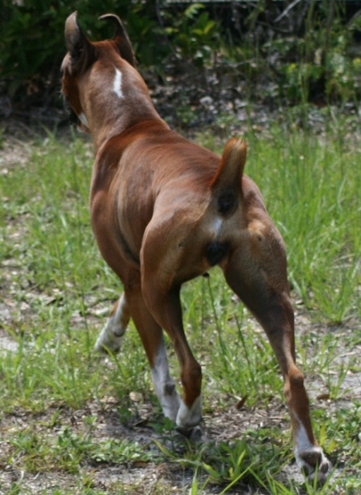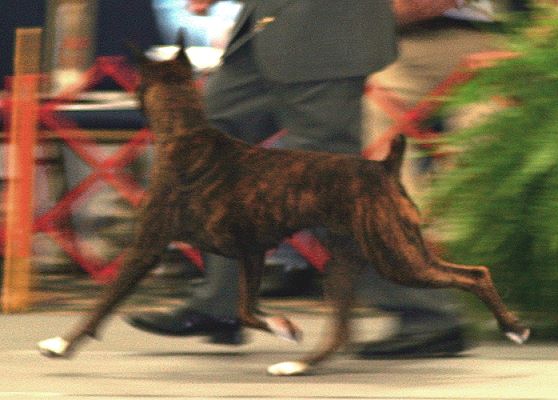 ![]() ![]() A couple pictures showing her getting some "air time". The one on the left was caught just as her left fore and right hind have left the ground, but the opposing are still reaching forward. The picture on the right you can see that her head is higher than normal (just spotted the cat), and this has added additional bounce to the front as well (and a good argument for not "stringing up" your dogs in the ring). |