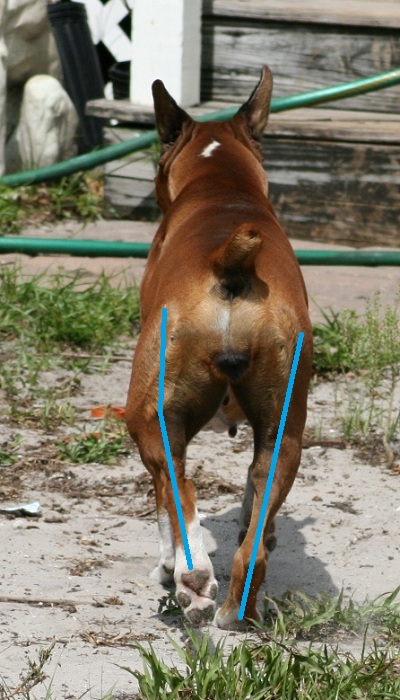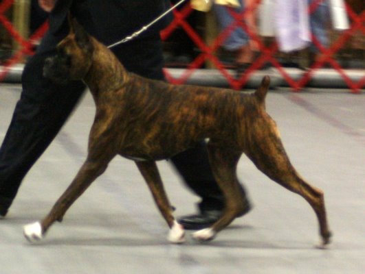 ![]() ![]() This is my Reese, Ch. Country Time's Sweet Home Alabama. On the left she is being moved on the down-and-back, so is not "moving out". However it is clear that the right hind is prepared to land in the spot the right fore is about to vacate. On the right they are finishing up their trip around the ring and she is preparing to stop (notice her head looking up at her handler?) I'd like to see both feet hit the ground at the same time, but she's starting to change her pace and has shifted her center of balance. |