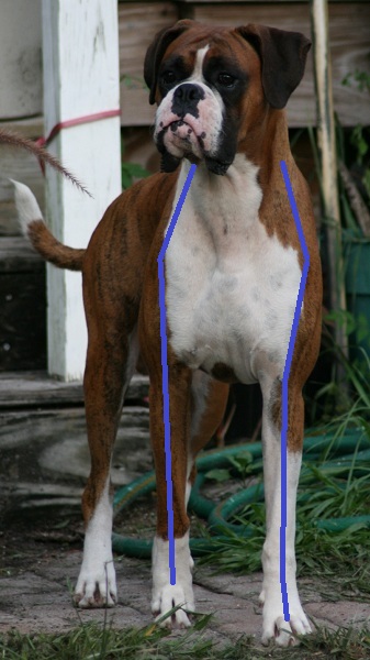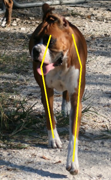 ![]() ![]() Whether standing or moving, the line from point of shoulder down to the foot should remain straight. Moose's left fore looks twisted, but it is the angle of the camera plus he is not squared up in front. |