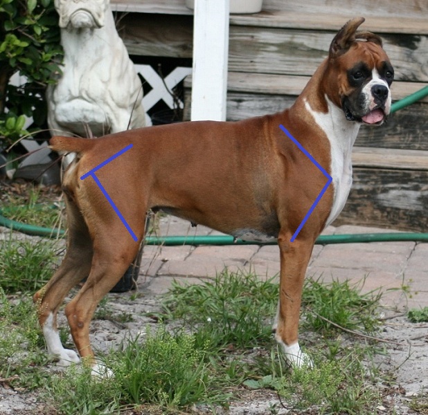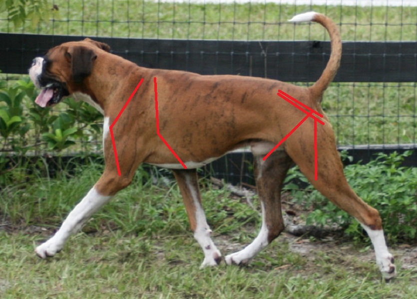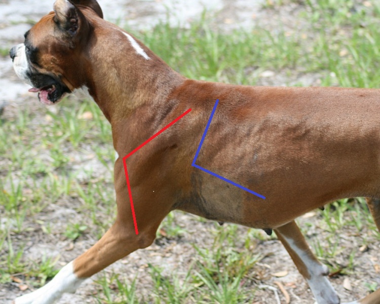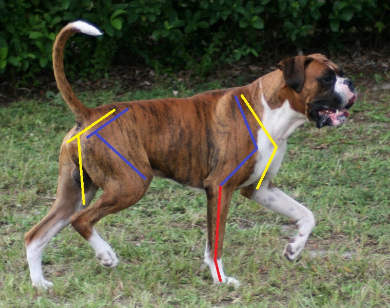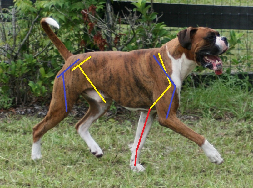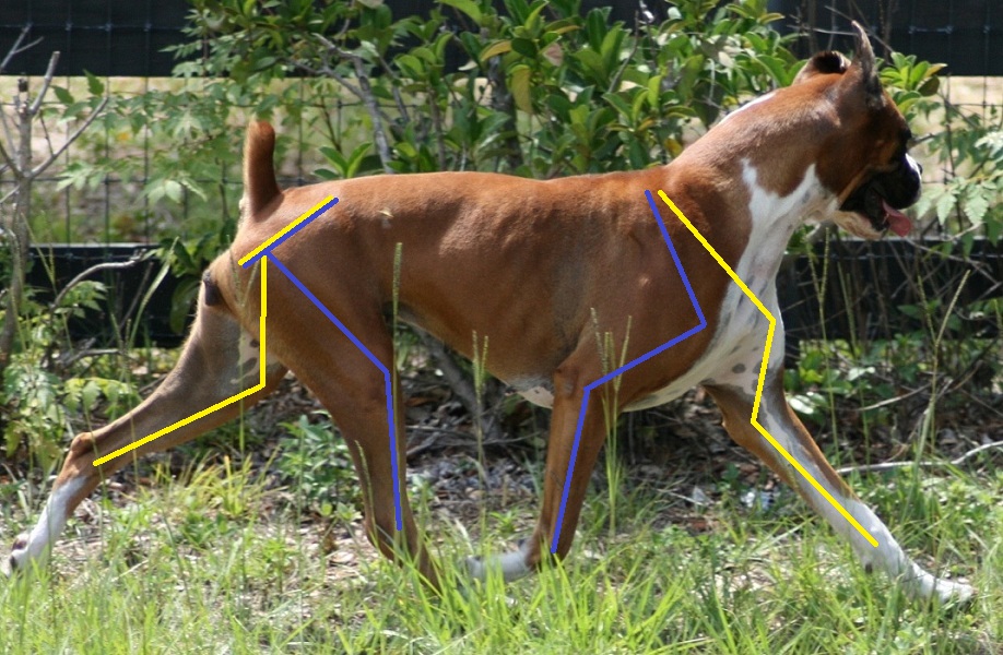 I will attempt to describe how conformation affects their movement, using illustrated photos to show the hidden "lines" of the underlying bone structure. I have drawn the lines as close to the actual position of the bones, but some people use a line from the point of elbow to point of shoulder, rather than where the upper arm actually attaches to the forearm. On the hip I drew from the hip socket to knee, rather than from the point of hip. This is a rather minor "bone of contention" for some people(pun intended), but is a little more realistic when evaluating the angles. |